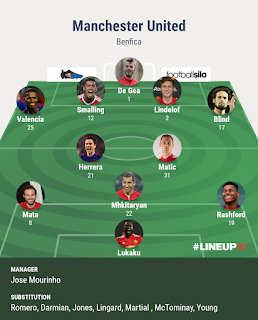 CONFIRMED MANCHESTER UNITED STARTING XI vs SL BENFICA Wednesday, October 18, 2017 Check out the changes Jose 'Uchenna' Mourinho has made to his United side to tackle the threat posed by Benfica. Click to view clearer Image. GLORY GLORY MAN UNITED. Share Get link Facebook Twitter Pinterest Email Other Apps Labels Confirmed lineup Share Get link Facebook Twitter Pinterest Email Other Apps